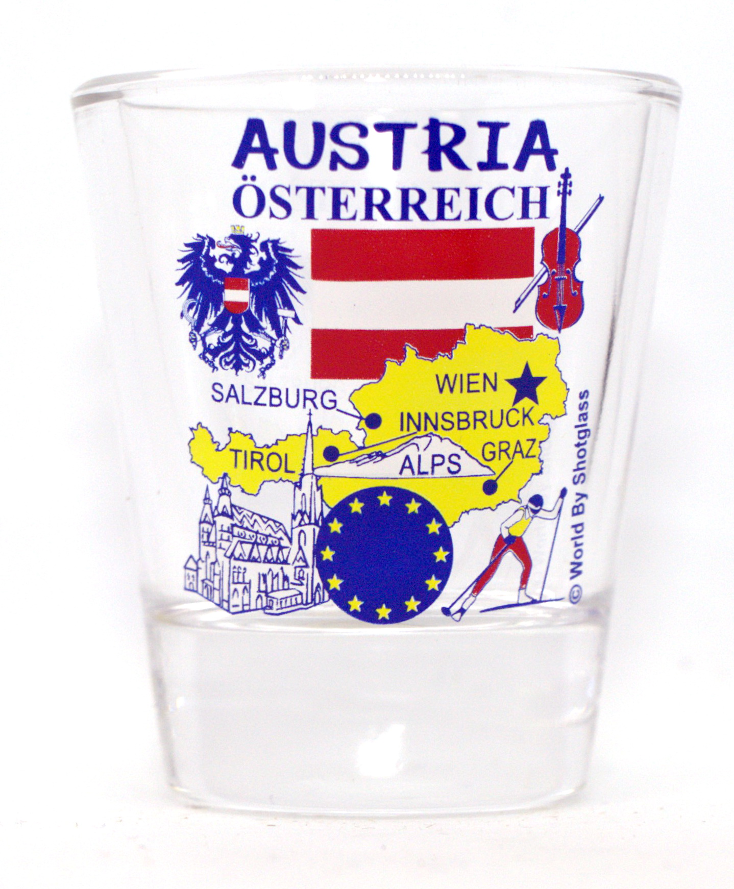 Here is a very rare and hard to find souvenir collectible shot glass from Austria. It is a 5x6cm style shot glass measuring 2.25 inches tall and 1.8 inches in diameter.